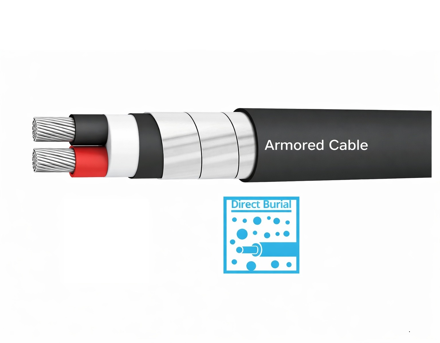 This cable includes an armored structure that improves mechanical protection and makes it suitable for direct burial installation.