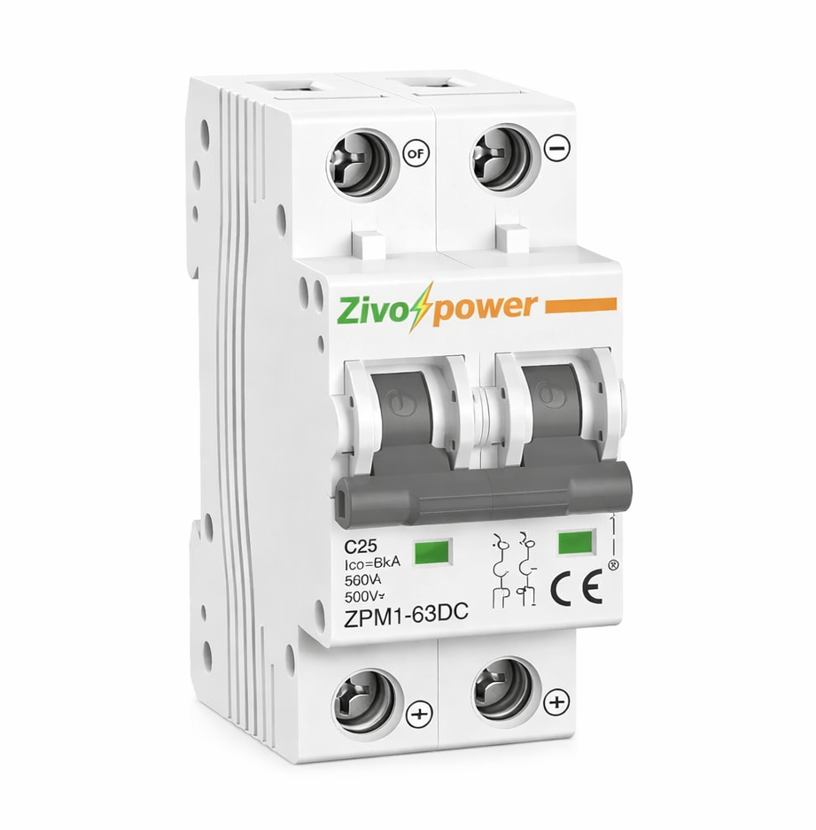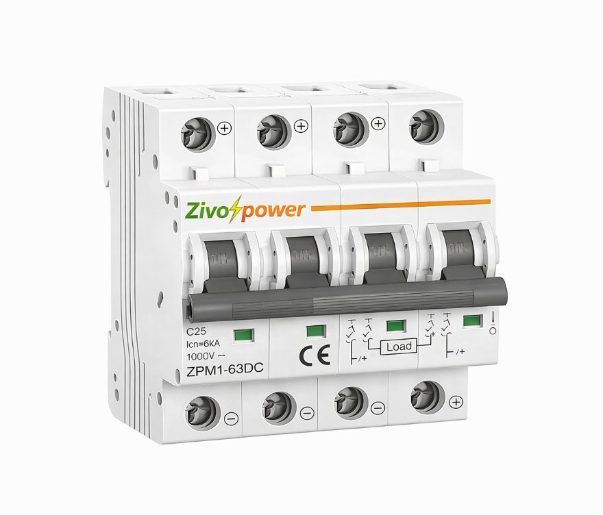 Zivopower DC MCB 6A-63A Mini Circuit Breaker is designed for overcurrent and short-circuit protection in photovoltaic and DC electrical systems. It is suitable for solar combiner boxes, battery systems, DC distribution circuits, and other applications where stable and reliable DC circuit protection is required.