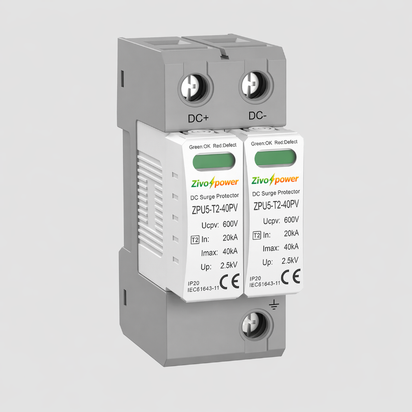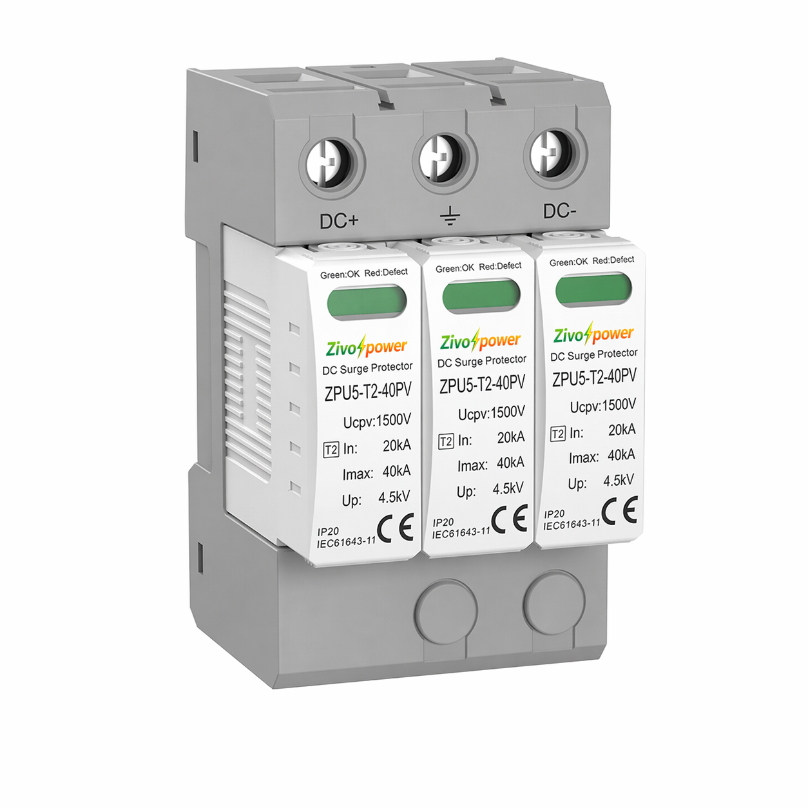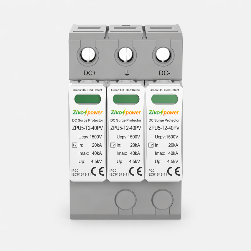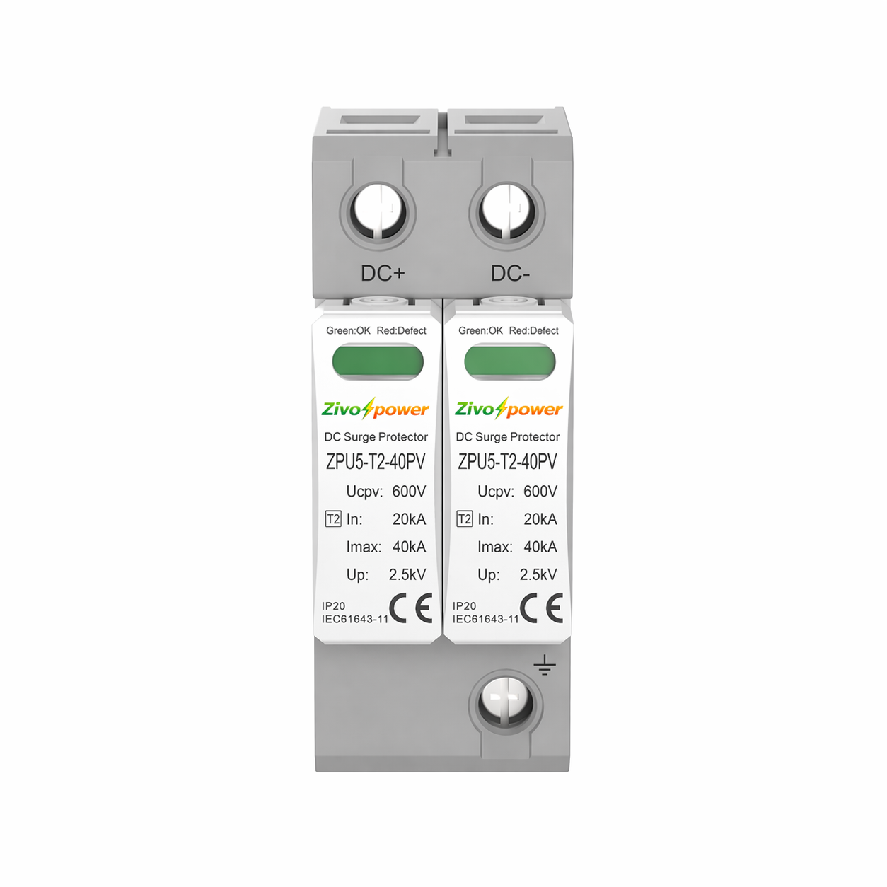 Zivopower ZPU5-T2-40PV Type 2 DC SPD is specially designed for photovoltaic power supply systems that require reliable protection against lightning surge and transient overvoltage on the DC side. This product is a pluggable multi-pole Type 2 / Class II PV surge protective device, intended to protect terminal devices in a solar PV system, such as solar panels, combiner boxes, and inverters.