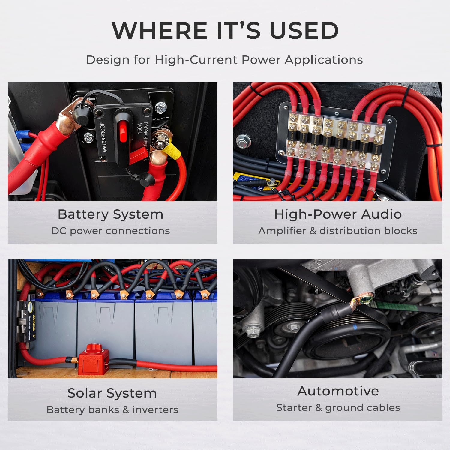 energy storage, marine, RV, solar, inverter, welding, and other high-current DC power applications.